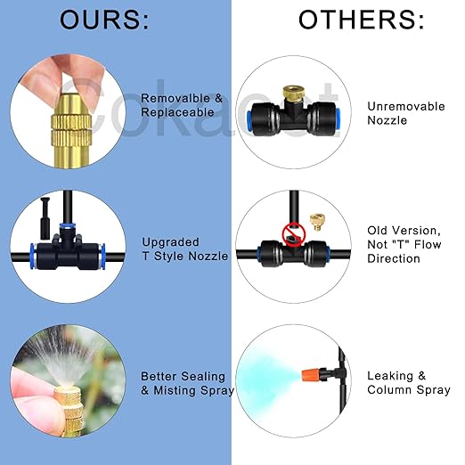 - Upgraded Misting Irrigation System - Cokacot 49.21Ft 8mm drip irrigation tubing system kit with upgraded brass misting nozzles and T-joints has better performance in anti-leaking and connection, the irrigation kit also comes with upgraded 1/2 inch and 3/4 inch faucet adapter with filter net for blocking impurities.
