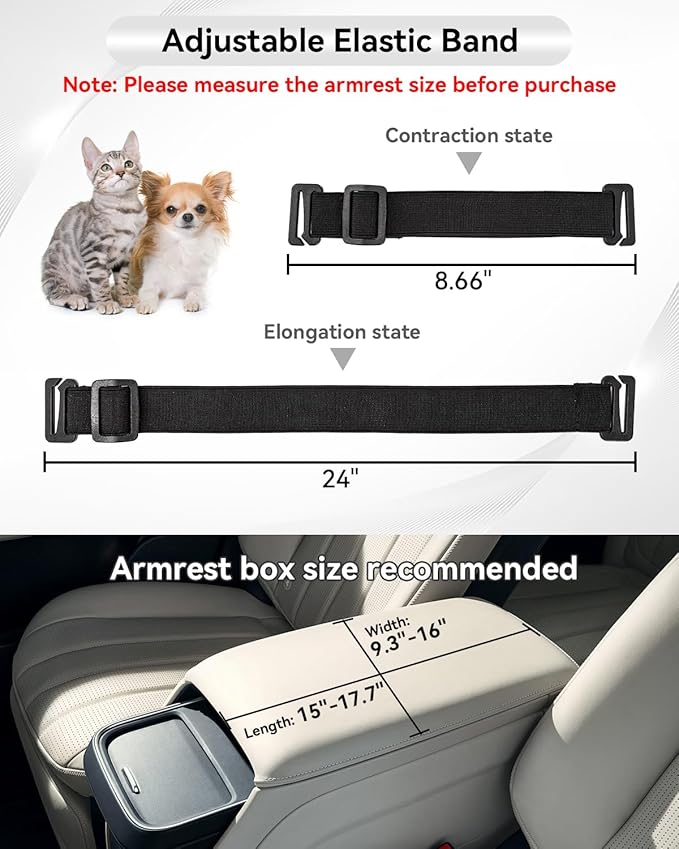 - [Dog Car Seat for Small Dogs] The external size of the console dog car seat are 17.13L x 9.45W x 8.46H inches and the internal size are 14.57L x 6.30W x 7.09H inches. We recommend it for small dogs or cats under 8 lbs. The pet car seat comes with 2 adjustable bottom webbing straps allowing the seat more fits tightly on the car armrest to prevent shaking and falling off.
