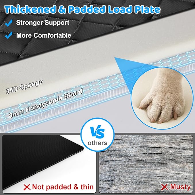 - Ultimate Comfort: Equipped with 8-layer protection including a layer of 35D sponge, this hard bottom dog seat cover delivers excellent comfort for pets during long rides. Compared to the competitor's single-layer thin board design, our padded hard bottom greatly reduces your dogs' joint pressure, while the non-woven fabric layer ensures durability and effortless removal for deep cleaning of the dog car seat cover