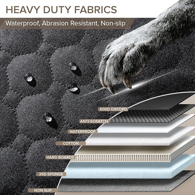 - 7-LAYER MATERIALS FOR STRONG SUPPORT, PROTECT AND COMFORT - Constructed with heavy duty materials including 600D scratch-resistant Oxford, waterproof fabric, thickened hard bottom boards, 35D soft sponge and cotton layers for added comfort and non-slip fabric that wouldn’t slide. Pet seat cover for back seat safeguards trucks from wear, water, and stains, extra-high door protector prevents scratches, allowing dogs to hop in and out joyfully, leaving you with perfectly preserved interio