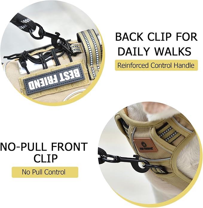 - MOLLE System: Featuring multiple Hook & Loop panels and additional MOLLE straps, our tactical harness can carry a variety of equipment, including pouches, water bottles, and tactical dog gear. It's versatile for personal service, law enforcement, hunting, or outdoor adventures. This system also shows your dog's personality; the package includes an extra "BEST FRIEND" label for customization