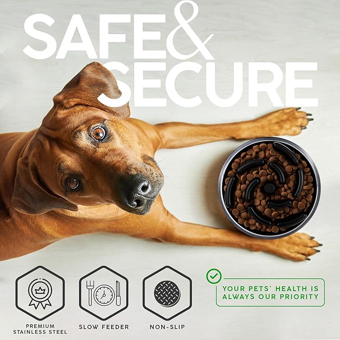 - Pet Safe: Made with BPA-free materials, our stainless steel slow feeder dog bowl and premium slow feeder insert for dog bowl ensure a safe and healthy dining experience for your furry friend. Designed to double as no-spill water bowls and insulated feeders, they keep food and water fresh longer. The sturdy, wide base with a bottom suction cup anchors the bowl securely during mealtime, providing stable, spill-resistant feeding—even for energetic eaters. Whether you’re looking for a complete slow feeder dog bowl or a reliable slow feeder insert, we’ve got you covered.