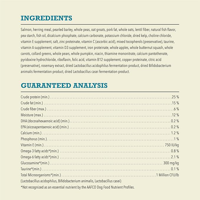 - Fiber from wholesome grains, vegetables and fruit, plus a blend of probiotics, help support digestive health in this kibble.