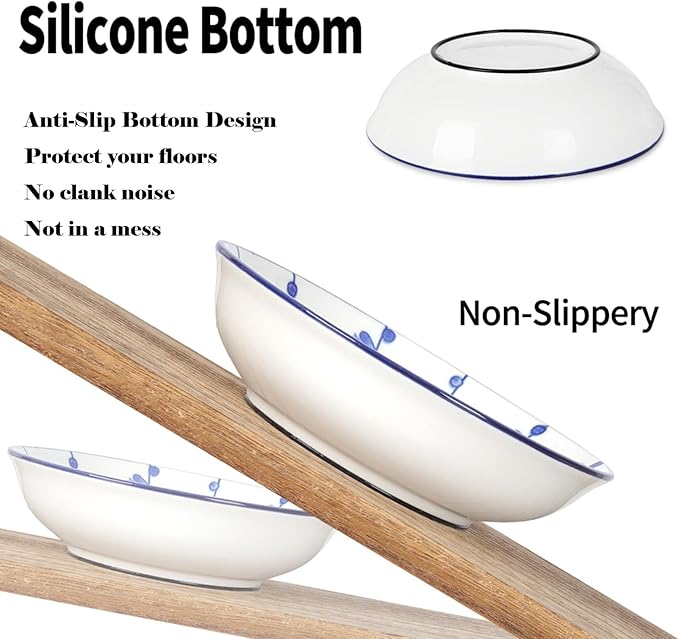 - Non-Slip, No Spill Cat Food Bowls:The cat food bowls are integrated with soft nonslip silicone base on the bottom to prevent the cat dishes sliding or moving around or tipping over! The no spill cat bowls minimize food scattering and water splashes, keeping floors clean and unscratched