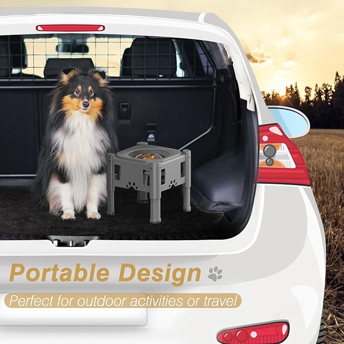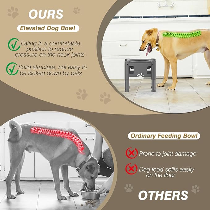- 【Reduce Joint Pressure】: This elevated dog bowls stand can be adjusted to 3 levels (15.6cm/6.1"-19.6cm/7.7"-23.6cm/9.3") according to your pet. Easily adjust by pressing the circular button on the stand. Provide a comfortable feeding position for small to large dogs and relieve the stress on the pet's neck and joints. Great ideal for older dogs, dogs with muscle or joint problems.