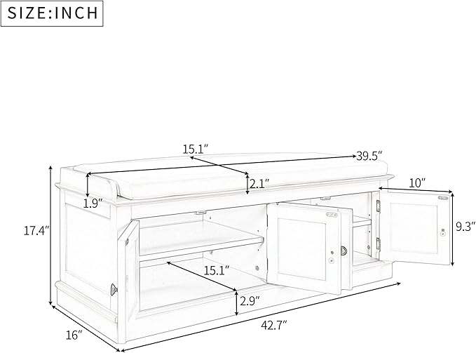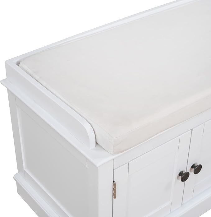 - Classic Style: The storage bench with cushions brings decorative and functional storage items to your entryway,hall, mud room or laundry room. There is magnetic attraction in the door and 4 round handles are simple and practical, which is convenient for you to open and close.