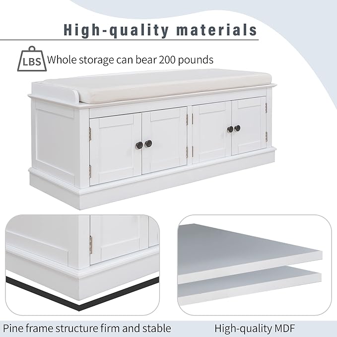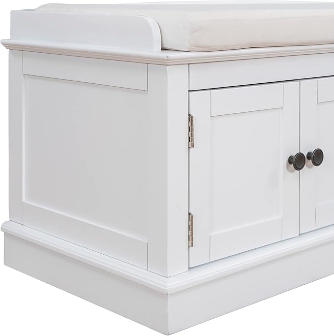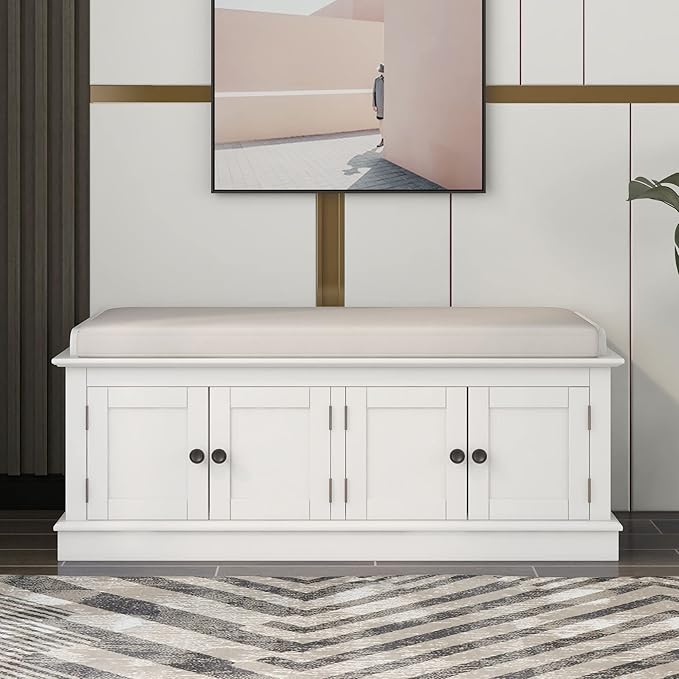 Storage Bench with 4 Doors and Adjustable Shelves, Shoe Bench with Removable Cushion for Living Room, Entryway 42.7" L x 16" W x 17.4" H (White)