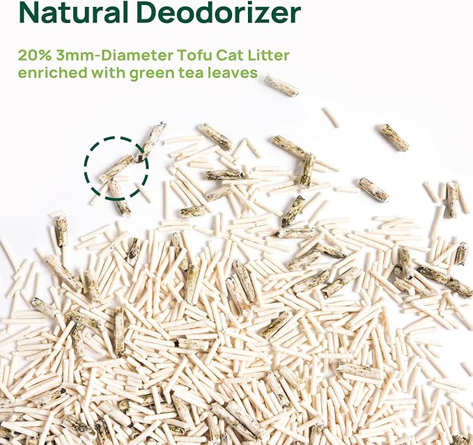- 20% of the tofu cat litter is made from natural green tea leaves, peas, and corn starch, with a diameter of 3.0mm.