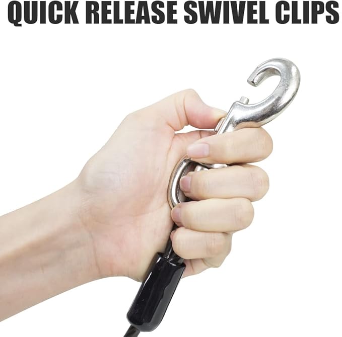- RUST-RESISTANT DESIGN FOR LONGEVITY: Our tie out cable for dogs comes with crimp and swivel clip covers, providing enhanced strength and protection against rust, ensuring a durable and reliable outdoor experience for your pet.