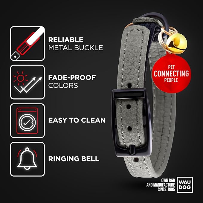 Leather Cat Collar with Bell and Safety Elastic Strap Breakaway Alternative for Small & Large Kittens, Stylish Pet Leather Collar for Boy, Girl Cats with Metal Buckle & QR ID Tag (Gray)