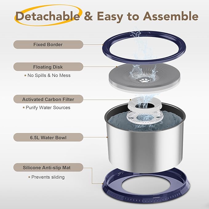 - Easy to Clean: The removable floating disk combined with the filter cartridge made of non-woven fabric, activated carbon and ion exchange resin can filter the water layer by layer to remove impurities hair and other fine particles, deeply purify the water and provide clean, fresh water. We recommend disassembling and cleaning the floating disk at least twice a week and replacing the filter every 2 months.