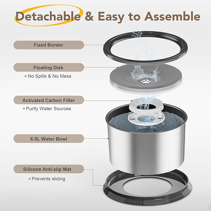 - Easy to Clean: The removable floating disk combined with the filter cartridge made of non-woven fabric, activated carbon and ion exchange resin can filter the water layer by layer to remove impurities hair and other fine particles, deeply purify the water and provide clean, fresh water. We recommend disassembling and cleaning the floating disk at least twice a week and replacing the filter every 2 months