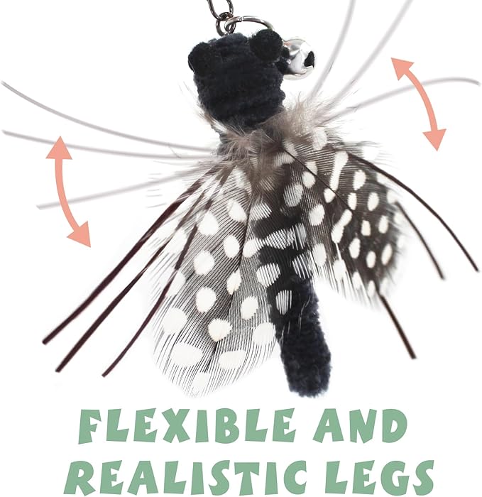 - [LIFELIKE INSECT DESIGN] The insect cat toys has different colour of fuzzy body with colourful feather wings. Each insect also has flexible and realistic legs, which can dance gracefully like a real insect when it moves, as the same time triggering toys front-end bells, Cats will love to swat, pounce and chase these insects.