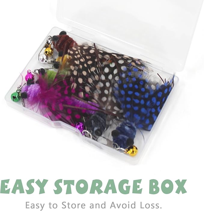 - [EASY STORAGE AND COMPATIBLE] All the cat toy wand refills were in a storage box, which is very practical. You can also use it to store similar small items. Each cat feather toy replacement is equipped with a clasp that works with any cat rod with an eyelet hook connector. It can also be hung to any place you want for your cat to play with, bring more play options and fun to cats.