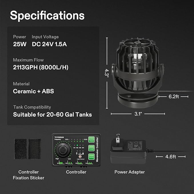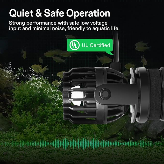 - Magnetic Base & Adjustable Head: The strong magnetic base enables secure and flexible wall installation; The integrated silicone mats minimize vibration and recoil; The 120° vertically adjustable head and 360° adjustable base promote comprehensive water circulation throughout the tank; Recommend for 20-60 Gallon aquariums with glass ≤12mm (0.5”) thick