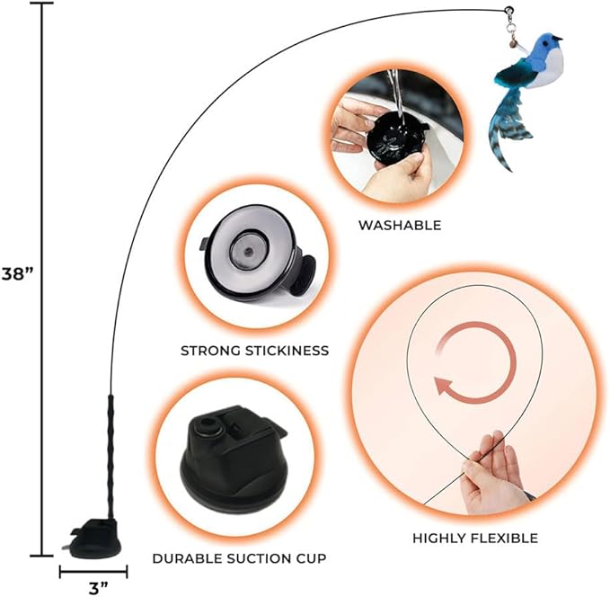- DURABLE & EASY TO USE: The interactive cat feather toy includes a highly flexible rod and a strong suction cup base that can be attached horizontally or vertically to any flat, clean surface. The best part is that it requires no interaction from you, and your cat can play whenever they want. 2 Replacement sticky pads are included so the fun never ends.