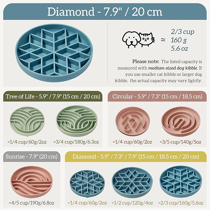 OHMO Slow Feeder Dog Bowls (Diamond, 8" Sage Green) Enrichment Soft Silicone Food Safe Feeding Bowl Non Slip Suction Cup for All Breed Pet, Cat Slow Down Eating Dishes, Boredom and Anxiety Reducer