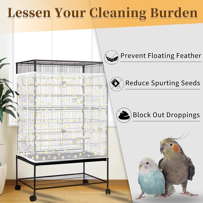 Daoeny Bird Cage Seed Catcher, Large Bird Cage Cover, Adjustable Soft Airy Nylon Mesh Net, Birdcage Cover Skirt Seed Guard for Parrot Parakeet Macaw African Round Square Cages (White, Daisy Design)