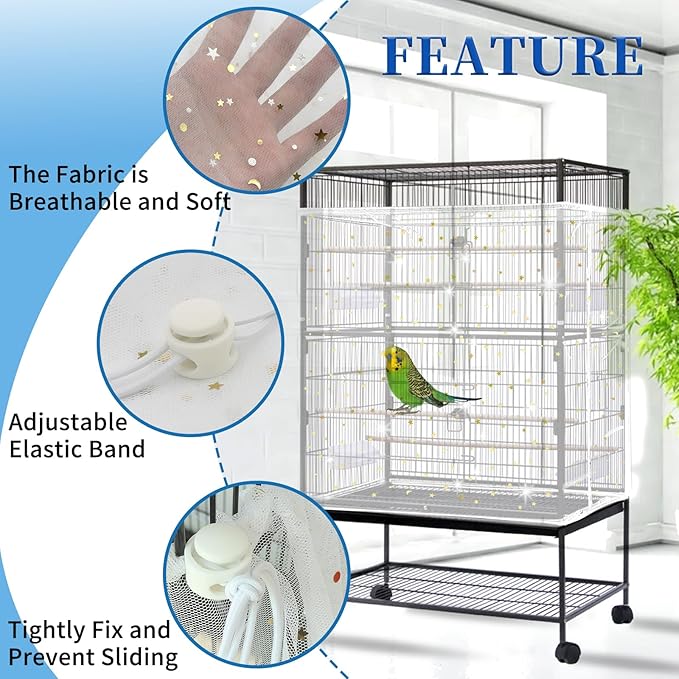 Daoeny Bird Cage Seed Catcher, Large Bird Cage Cover, Adjustable Soft Airy Nylon Mesh Net, Birdcage Cover Skirt Seed Guard for Parrot Parakeet Macaw African Round Square Cages (White, Sequins Star)