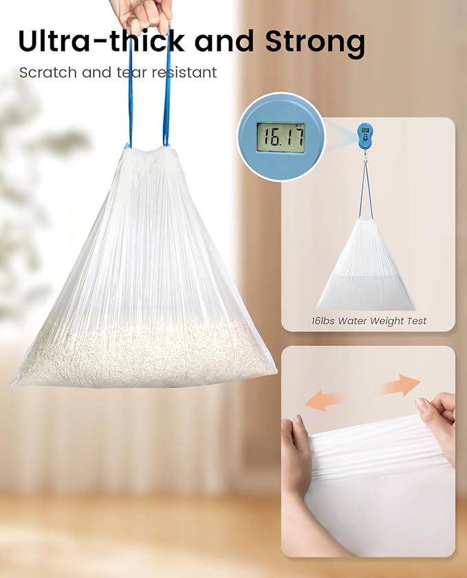 - DRAWSTRING DESIGN: Are you still troubled by getting your hands dirty when changing litter? With our cat litter liners equipped with widened double-layer drawstring handles, disposing of the waste becomes easier. Just grab the drawstrings, lift, and the kitty litter bags will securely shut to prevent any spills.