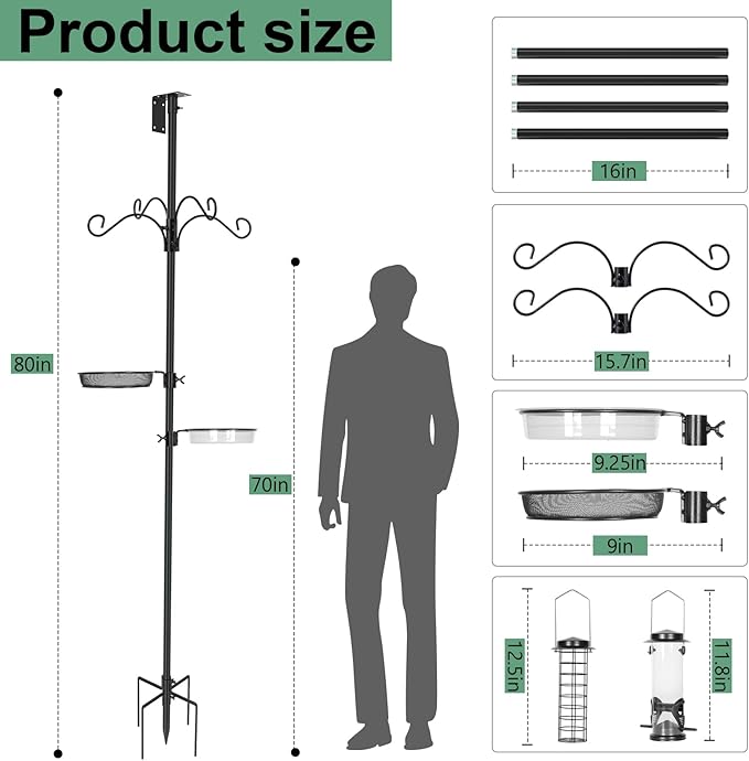 - STURDY DESIGN: Our pole kit provides solid prongs base to support bird feeders, house. The metal powder-coated so it will not rust easily. The diameter of pole is 0.9 inch. The pole height is 80 inch (6 feet tall). The bird house is not included in the package