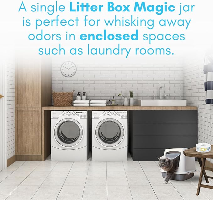 - KEEP LITTER BOX ODORS UNDER CONTROL – Our cat box deodorizer pro-grade strength formula is designed for litter box odor control, lasting up to 30 days. Simply twist open the jar and let it do its job—ideal for bathrooms, closets, enclosed basements, and small, poorly ventilated areas. Its continuous odor-inhibiting properties can help with intense cat smells for 30 days.