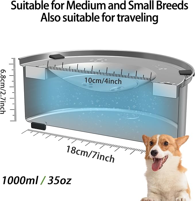 - ੯‧ ζ 𝐋𝐚𝐫𝐠𝐞 𝐂𝐚𝐩𝐚𝐜𝐢𝐭𝐲 𝐚𝐧𝐝 𝐋𝐢𝐠𝐡𝐭𝐰𝐞𝐢𝐠𝐡𝐭: This No Spill Water Bowl For Dogs has a large capacity of 1 liters/35 floz, which is large enough for your pets to drink water or food at one time. The lightweight design makes it easy to carry and use.