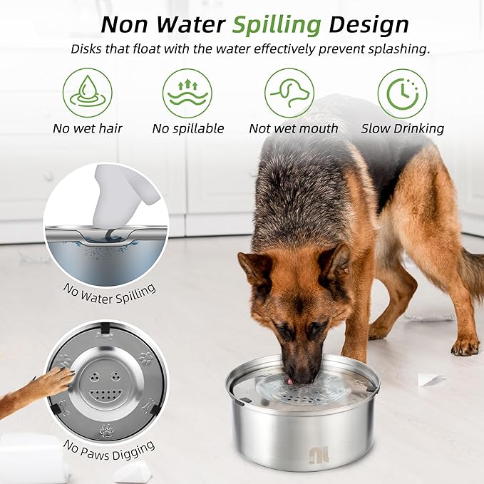 - ੯‧ ζ 𝟏𝟎𝟎% 𝐒𝐭𝐚𝐢𝐧𝐥𝐞𝐬𝐬 𝐒𝐭𝐞𝐞𝐥 𝐚𝐧𝐝 𝐁𝐏𝐀 𝐅𝐫𝐞𝐞: The No spill dog water bowl is made of high-quality food-grade 304 stainless steel, which is safe, non-toxic, odorless, and durable. The water bowl is designed without bpa, making it safe for your pet.