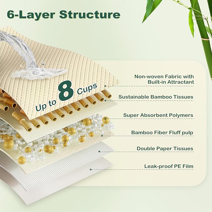 - Innovative 6-Layer Design: The paper part of this product comes from FSC-certified paper; Top non-woven fabric layer for quick absorption and fast drying; second paper tissue layer to absorb liquid; third layer of super absorbent polymer to turn liquid into gel; fourth layer of fluff pulp for extra moisture control; fifth layer of paper tissue for added protection; sixth layer of PE film to prevent leaks and protect floors