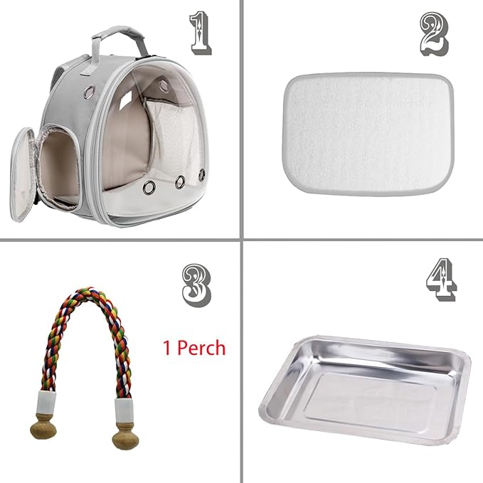 - Package Includes: 1 x bird backpack carrier; 1 x bendable rope stand perch; 1 x metal tray for easy clean; 1 x washable soft mat for replacement;