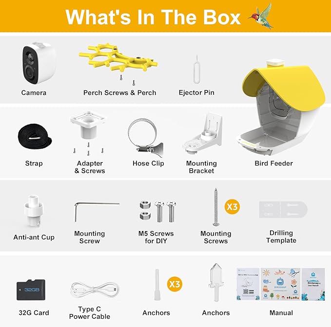 - 【Ideal Gift for Bird Lovers】birdsnap video bird feeder camera makes the perfect gift for birdwatching enthusiasts of all ages. It provides a 32GB Storage Card and cloud storage, allowing you to share beautiful bird moments with family and friends. Strengthen family bonds and create lasting memories with the joy of birdwatching together.