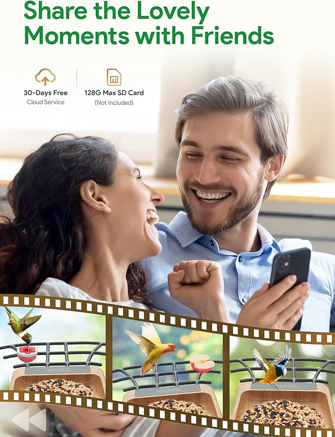 - 【Ideal Gift For Your Families & Free Storage】The smart bird feeder with camera can store bird videos and pictures in the cloud for free up to 30 days, and you can extend it by subscribing or store it in a TF card (not included). Share beautiful moments with family and friends anytime, anywhere, enhance communication.It's a great outdoor bird watching gifts for bird lovers, children, parents and the elderly