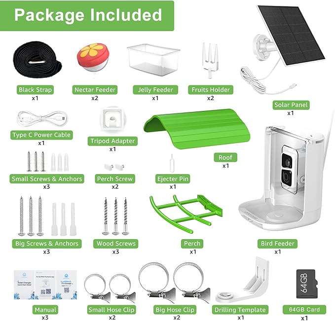 - 【64GB Card to Save Videos】We provide a 64GB storage card storing more than 40000 10s-videos. (Support cloud storage & AI recognition subscription.) The camera bird feeder is IP65 weatherproof, protecting it under sunshine/wind/heavy rain/snow, etc. Even if there is no network or a weak network, you can take out the card and export the automatically downloaded videos in it