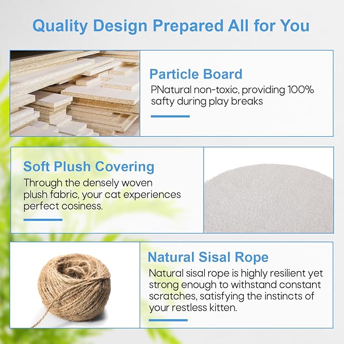 - 🐱 【Posts for Scratching Covered in Sisal 】These are scratching surfaces that are integrated into the framework. Cats love to bury their claws in sisal because it's a sturdy substance with a coarse texture. Our cat tree promotes healthy scratching habits and helps discourage cats from damaging furniture by offering dedicated spaces for them to scratch.