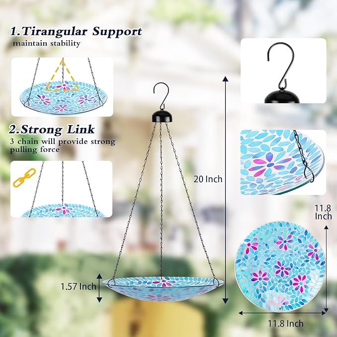 - Beautiful Mosaic Flower Bird Bath: Uses special substantial nontoxic glass, causes zero harm to birds and other creatures, and this hanging mosaic bird bath has beautiful flower pattern and distinctively bright-colored which would attract more birds to bathe