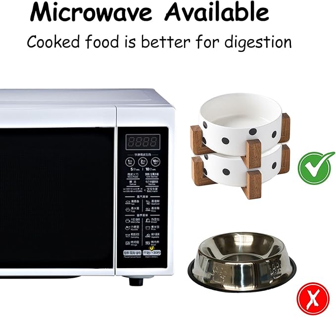 - DISHWASHER MICROWAVE SAFE - Ceramic pet bowls is made of Porcelain Ceramic with wood frame to keep from sliding on the floor. Ceramic cat dog bowls are free of lead and cadmium. High temperature ceramic, non-toxic harmless, no smell, durable. Clean sanitation, be helpful for pet health. and the cat dog food water bowls conveniently dishwasher safe so it can be easily cleaned. No Fuss.