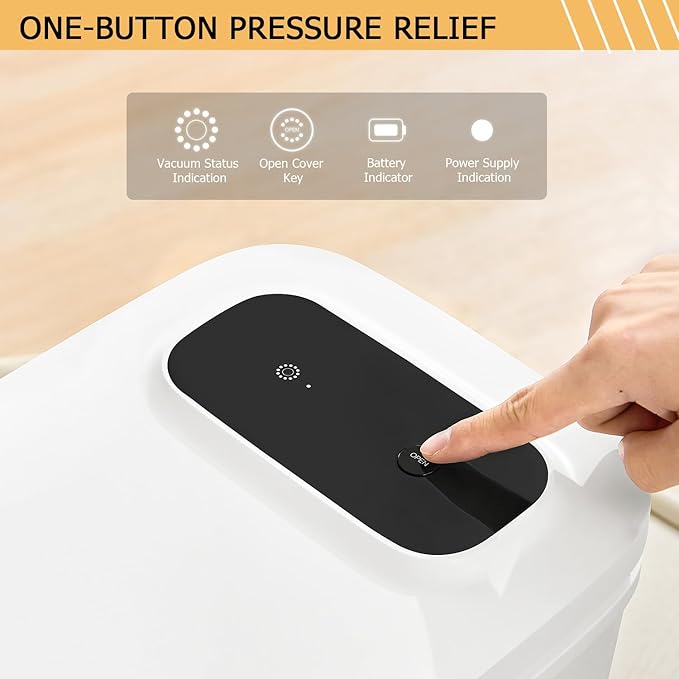 - Smart Vacuum Technology: The storage container initiates the vacuum-seal process 3 seconds after the lid is securely closed. Its smart system checks the pressure at 6-10 hour intervals. The container automatically activates its supplementary vacuum function once the negative pressure drops low. To release the vacuum, a 3-second long press is required, and the system includes a fault detection alert to prevent unintended pressure release