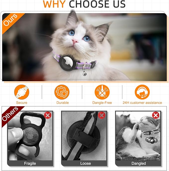 - 【LIGHTWEIGHT & COMFORTABLE】 This apple airtag cat collar is made of high quality nylon that won't hurt your cat's skin or cause any allergies. With the lightweight AirTag holder, your cat won't feel any discomfort even when wearing it for a long time.😽