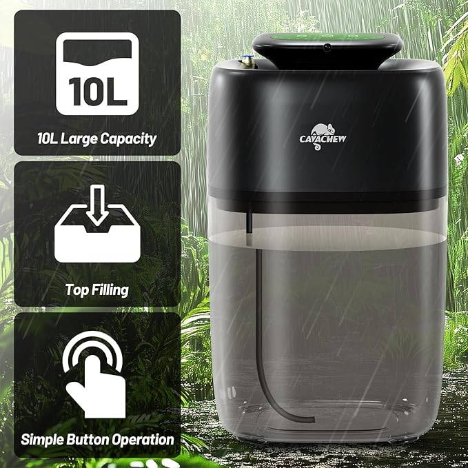 - Top Fill & Integrated Design: This reptile mister equipped with a large 10L water tank and top filling, integrated and visual design, no leakage during misting, water level can be observed at all times. Simulates natural rainfall which improves environmental humidity of habitat effectively, suitable for tropical rainforest reptiles and plants such as red-eyed tree frogs, chameleons, pineapples, orchids, mosses etc