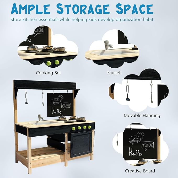 - Versatile Play Options: From cooking pretend meals to hosting BBQ parties, playing with sand and water, and expressing creativity through writing or drawing on the chalkboard, our kids' mud kitchen offers endless opportunities for fun and exploration.