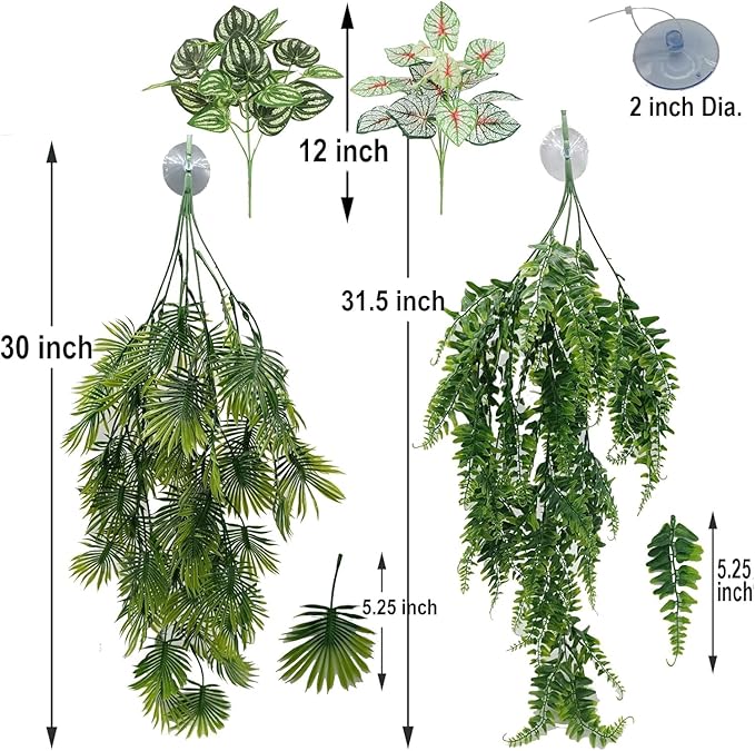 - 【Include】2 x Large Plastic Hanging Leaves vines, 2 x mini Hanging Ivy Plants of 12 inch / 31cm in length, 4 x large/strong suction cups of 2 inch / 5cm in Dia. Perfect for reptile habitat decorations, terrarium hanging, snake terrarium decorations.