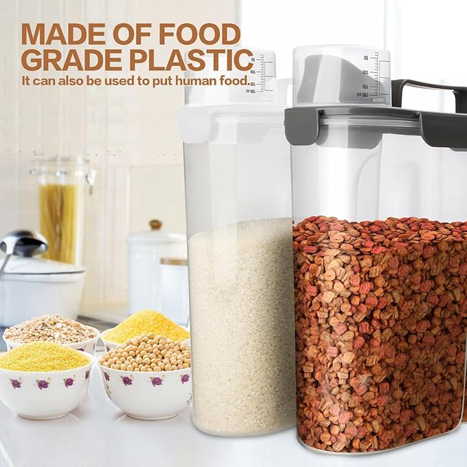 - Airtight BPA Free Food Container- Cat food bins have airtight silicone gasket and 4 snap lock latches to keep out moisture, humidity, and pests. BPA free durable clear plastic makes food can be checked at a glance