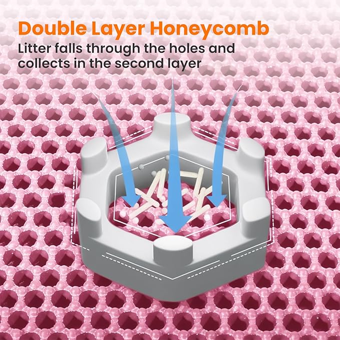- Double Layer Honeycomb Structure: The holes in the top layer trap all types of litter and let it fall through to the waterproof bottom layer for effortless cleanup. Just lift litter catcher mat, pour the collected litter back, and reuse — no mess, no hassle. This smart design helps reduce litter waste and makes daily cleaning faster and easier!
