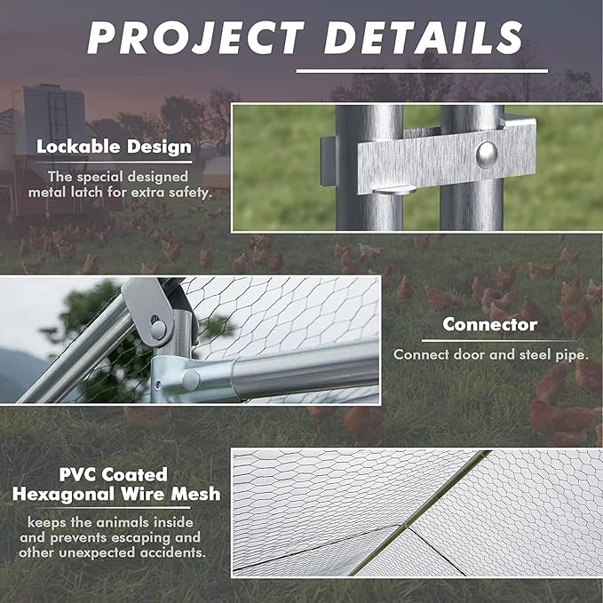 - Durable Steel Chicken run house: The chicken coop uses a durable steel pipe frame, coupled with galvanizing technology, don't worry about rusting in outdoor. The steel pipe diameter reaches 0.98 inches, which is strong and stable enough in windy and rain
