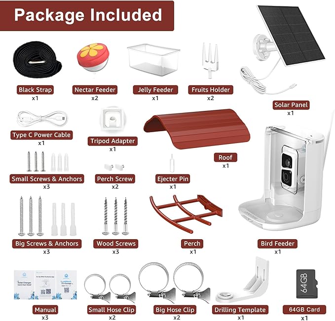 - 【64GB Card to Save Videos】We provide a 64GB storage card storing more than 40000 10s-videos. (Support cloud storage & AI recognition subscription.) The camera bird feeder is IP65 weatherproof, protecting it under sunshine/wind/heavy rain/snow, etc. Even if there is no network or a weak network, you can take out the card and export the automatically downloaded videos in it