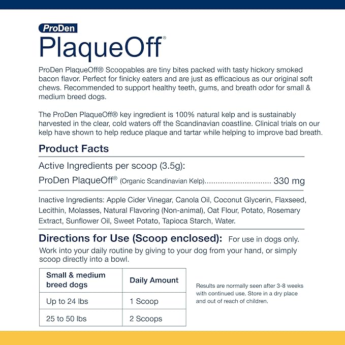 - Supports Dental Health - ProDen PlaqueOff Scoopables are specially formulated to support healthy teeth and gums in Small & Medium Breed Dogs, helping to reduce plaque and tartar build-up.