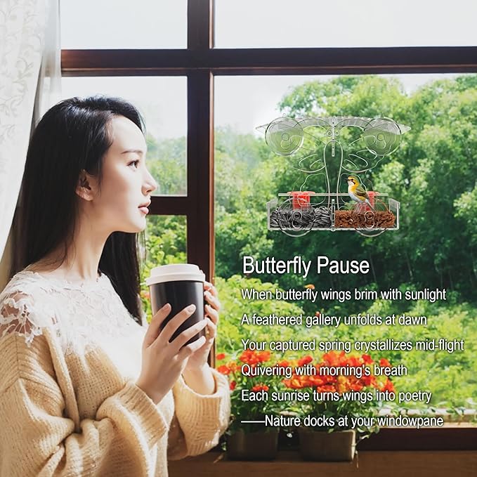- Squirrel Resistant Design: Beautiful Butterfly shape design, Can Indoor Outdoor and Windows decoration. Our see through bird feeder for window is crafted to keep squirrels at bay by hanging away from ledges and posts, ensuring a safe and enjoyable bird watching experience right from your home with your wild bird feeders for outside.