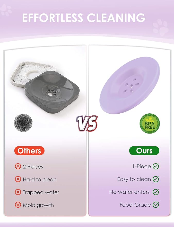 - 【One Piece Molded Floating Disk】Besides lid, the bowl also goes with a floating disk to slow down water drinking, also helps prevent dust, dirt, and pet hair from falling into the water. What’s more, it is an upgraded one piece molded floating disk, no water seepage, never get moldy or dirty, no need to pry open for cleaning.