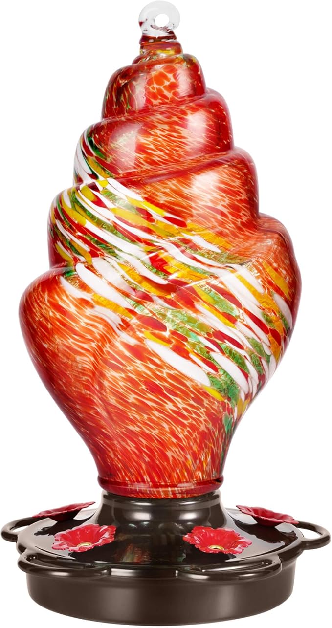 Spiral Shaped Hummingbird Feeder for Outdoors Hanging, Hand Blown Glass, 25 fl.oz, Leak Proof & Rustproof, Includes an Ant Moat, Metal Cover with 5 Feeding Ports, Red