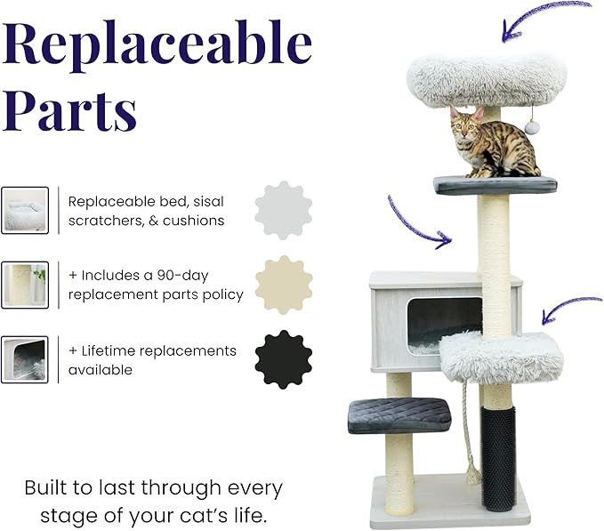 - Replaceable natural sisal scratching posts and beds.